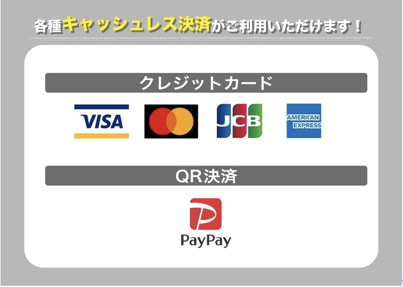 ・お支払い手段は現金のほか、各種キャッシュレス決済がご利用いただけます。